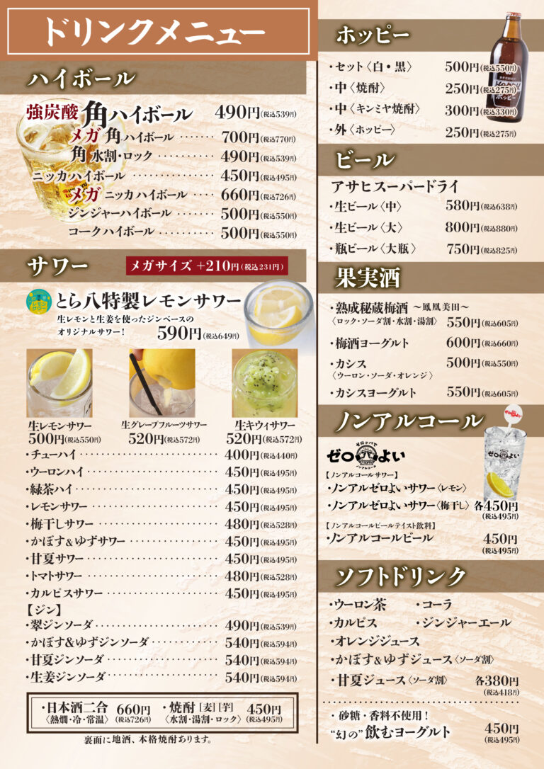 - 生ビール/瓶ビール(アサヒスーパードライ)、ノンアルコールビール、ホッピー(白・黒)、日本酒(燗・常温・冷)、ウイスキー角(ハイボール・水割・ロック)