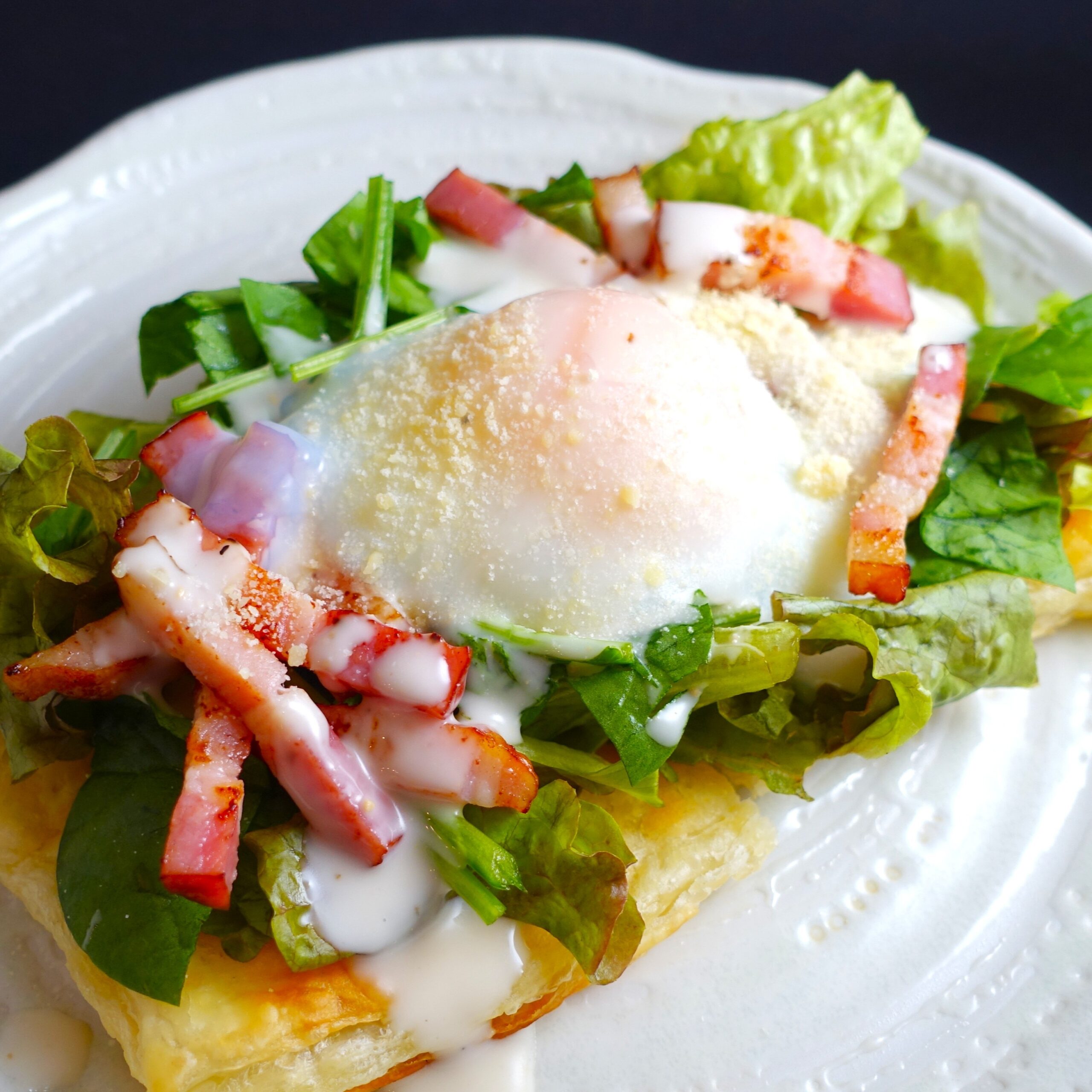 ベーコンとほうれん草、温泉卵の定番シーザーサラダをパイ生地と一緒に! 食べ応え抜群です。