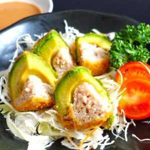 ヘルシーな鶏肉とクリーミーなアボカドがマッチした創作メンチ! オーロラソースでどうぞ。
