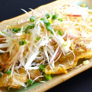 豚の薄切り肉をサクっと軽い天ぷらに。たっぷりのネギとミョウガ、ポン酢でさっぱりと!