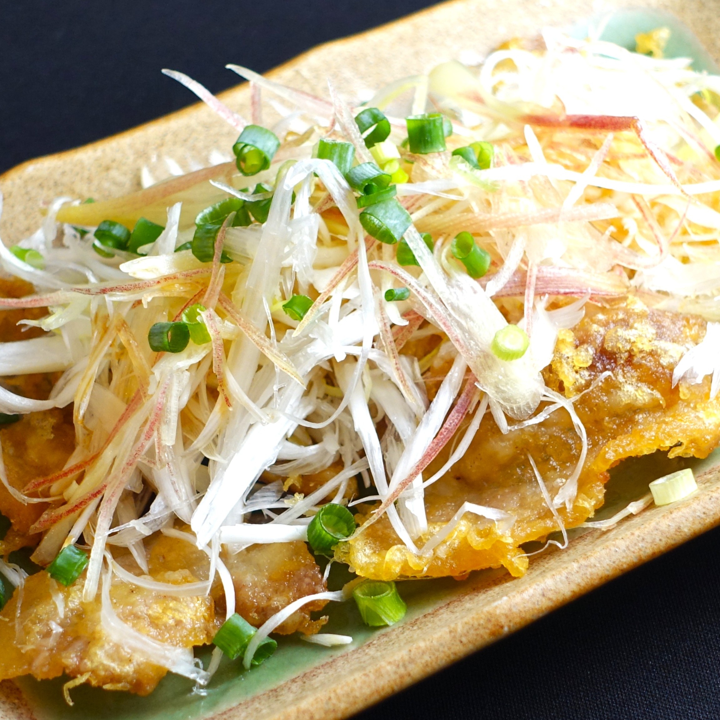 豚の薄切り肉をサクっと軽い天ぷらに。たっぷりのネギとミョウガ、ポン酢でさっぱりと!