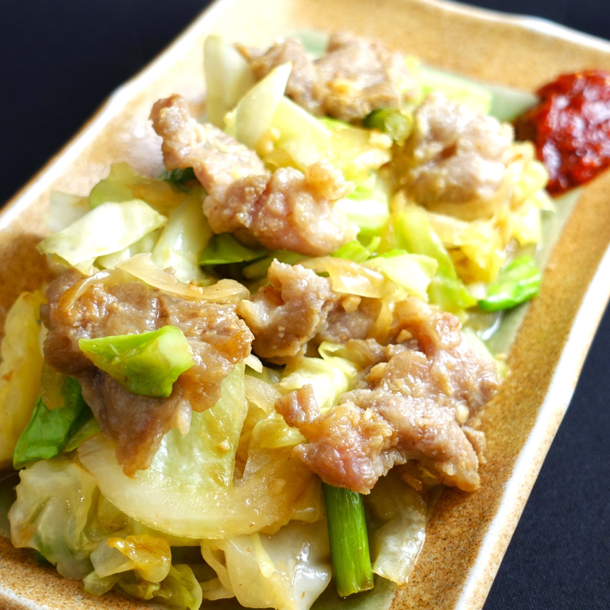 ジューシーな豚かしらを、たっぷりのキャベツとニンニクで炒め、自家製の絶品辛みそと一緒に!