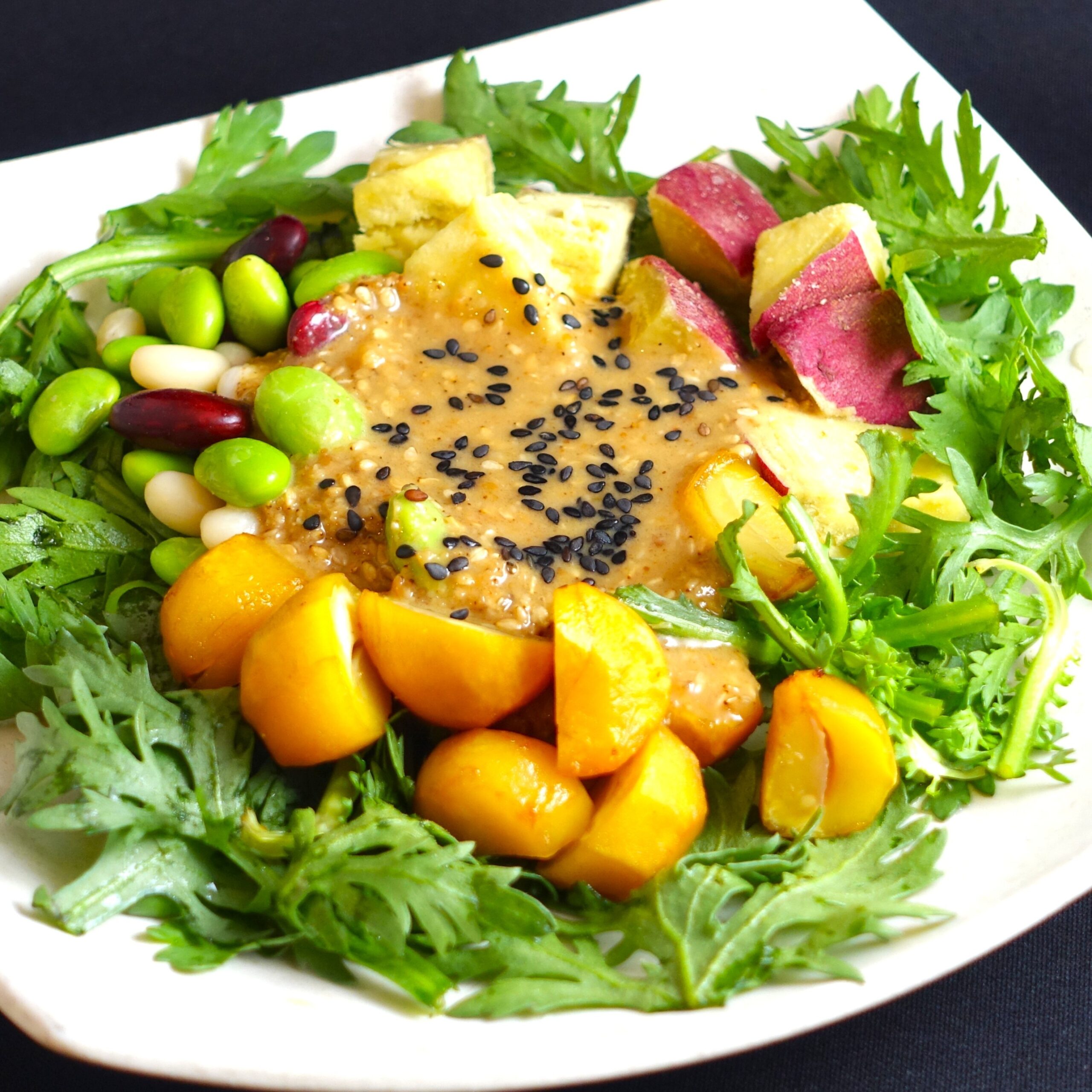 栗とさつま芋がごろごろ入った贅沢な秋の一皿。コク深い手作りゴマソースが自信作です!