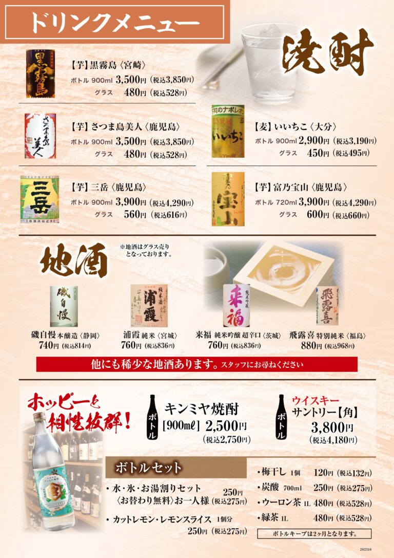 - チューハイ、レモンサワー、ウーロンハイ、緑茶ハイ、カルピスサワー、リンゴ酢サワー他、サワー各種