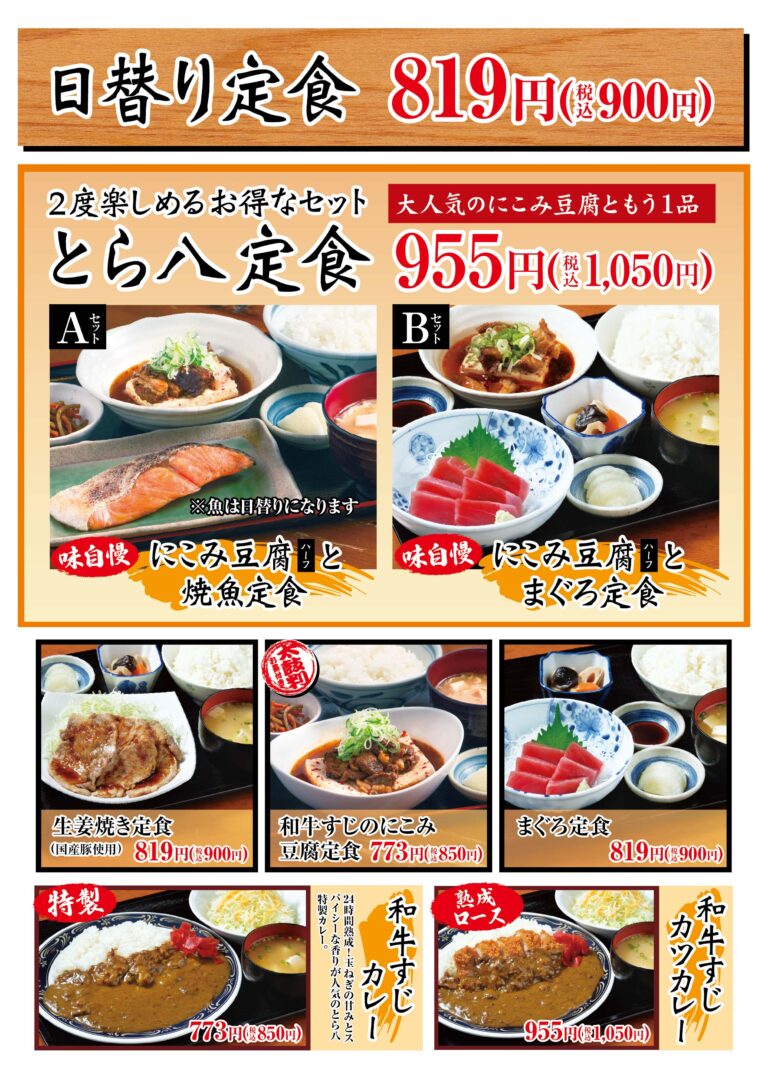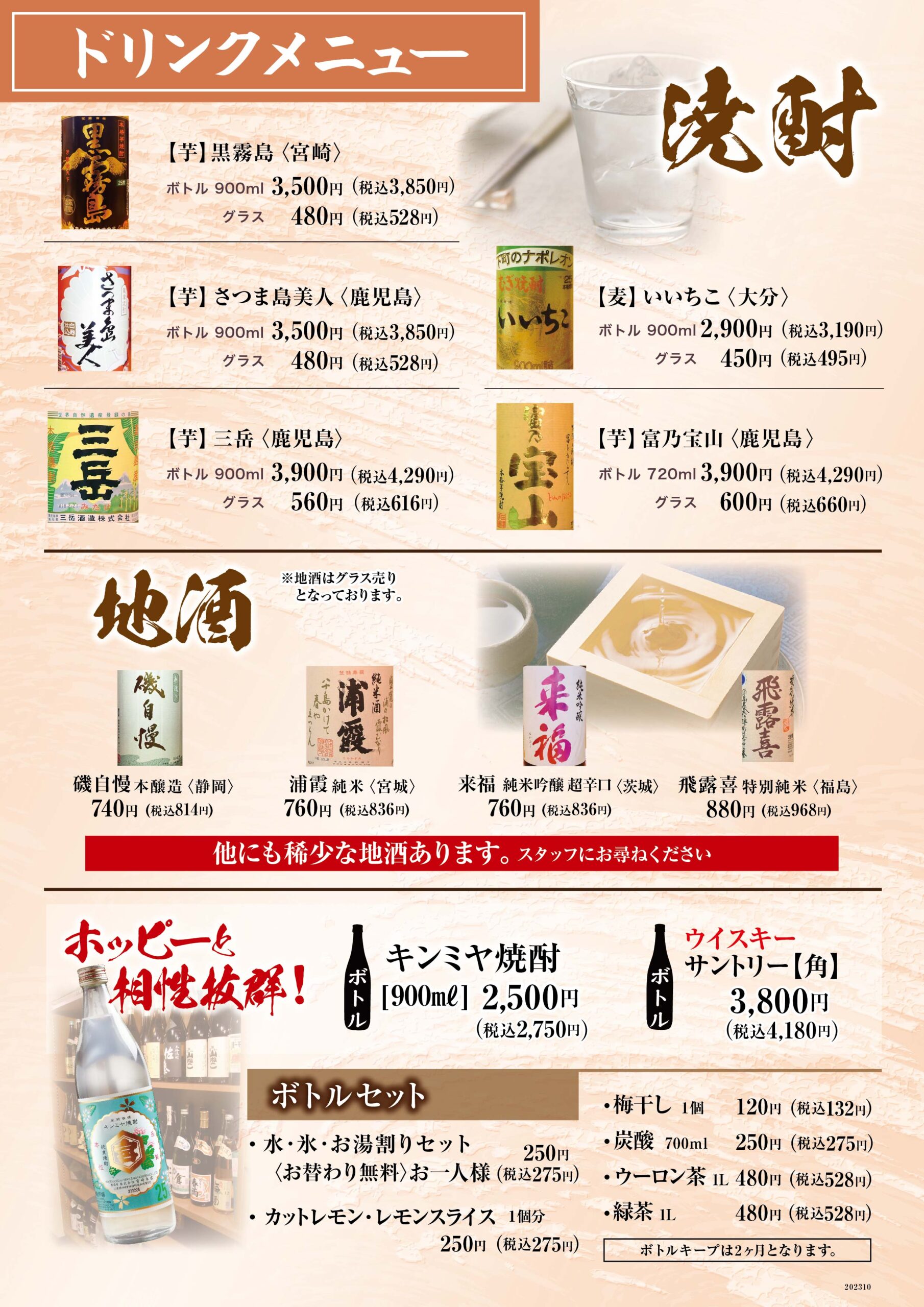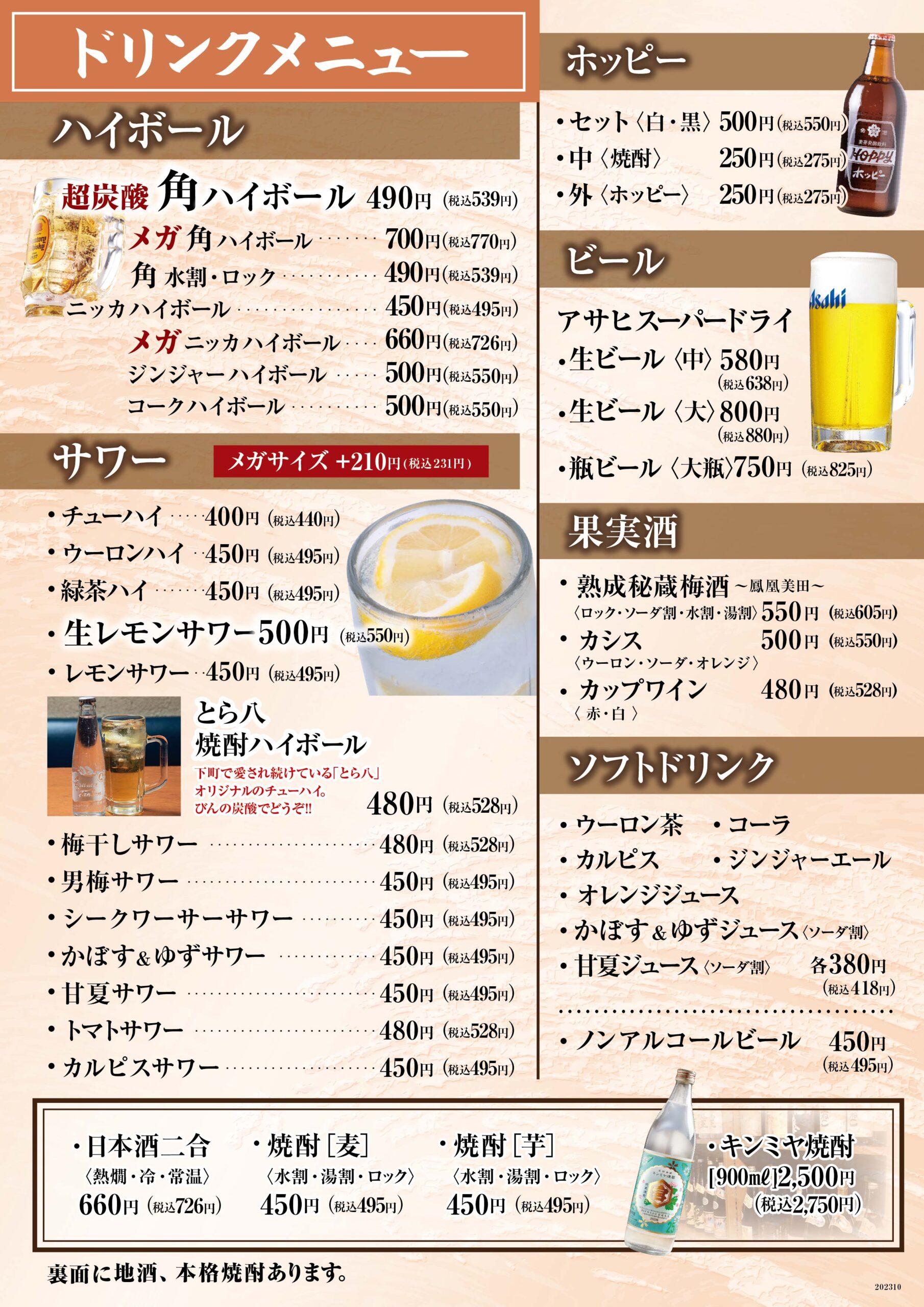 - 生ビール/瓶ビール(アサヒスーパードライ)、ノンアルコールビール、ホッピー(白・黒)、日本酒 富久娘(燗・常温・冷)、ウイスキー角(ハイボール・水割・ロック)、とら八焼酎ハイボール