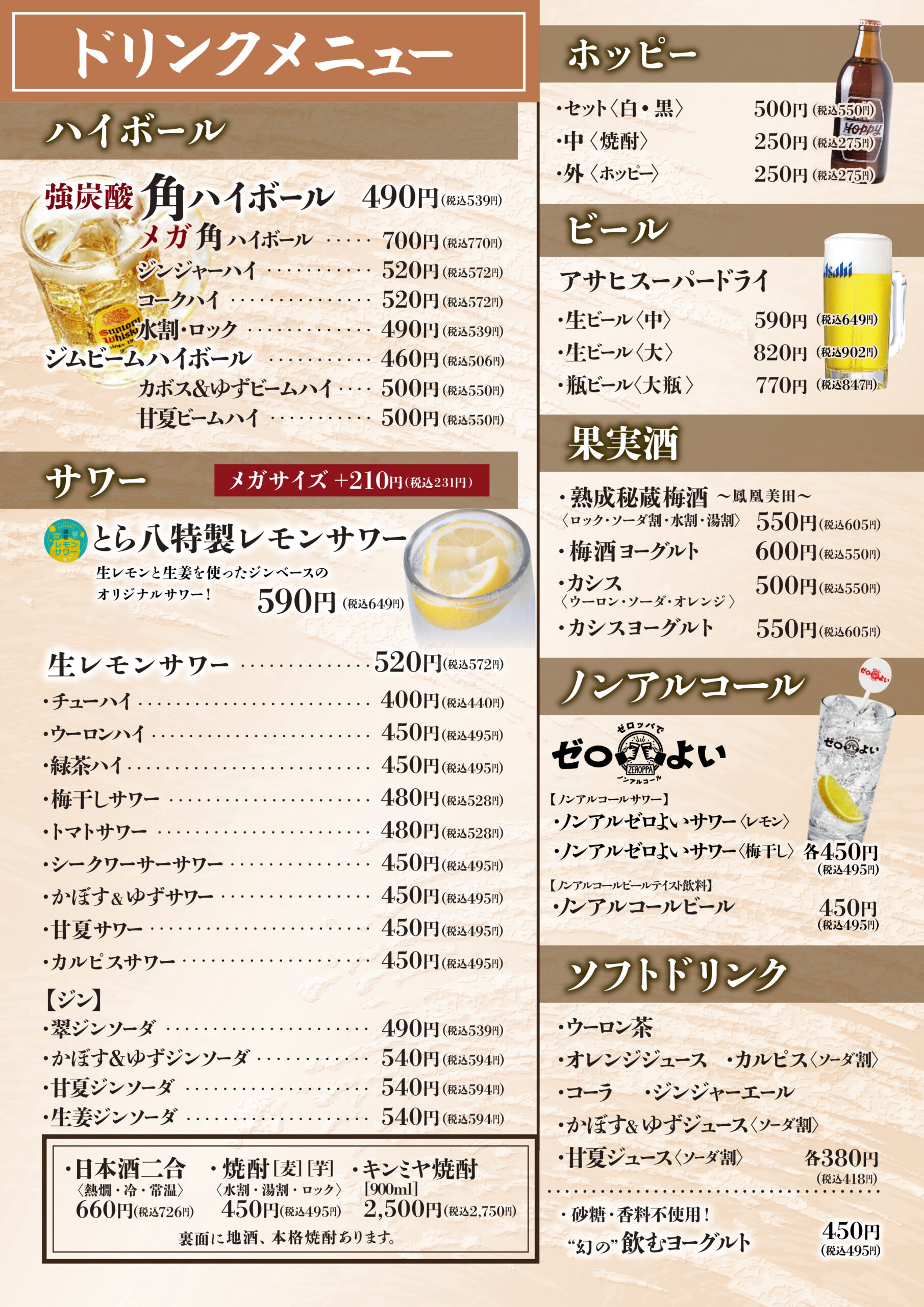- チューハイ、レモンサワー、ウーロンハイ、緑茶ハイ、カルピスサワー、リンゴ酢サワー他、サワー各種