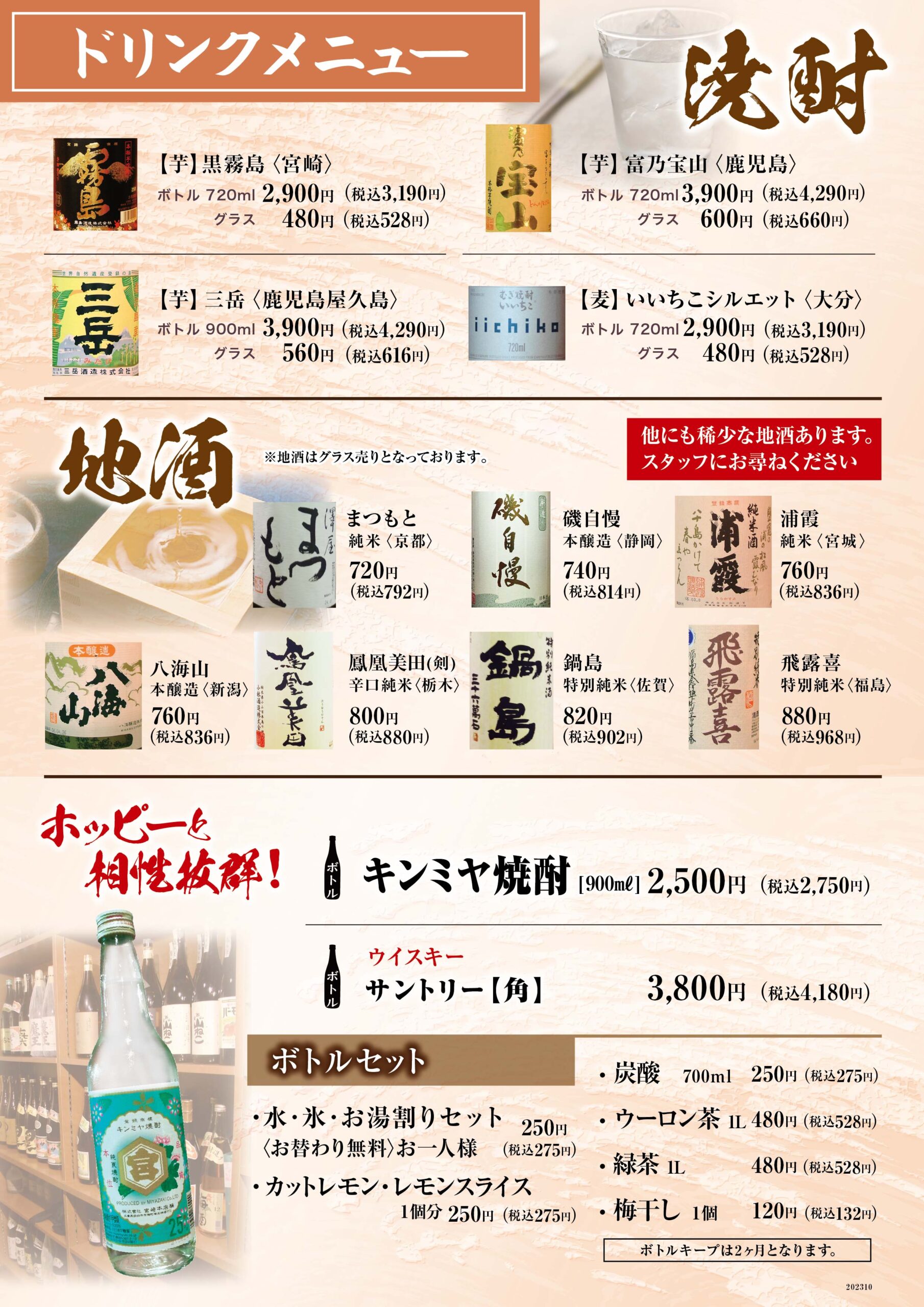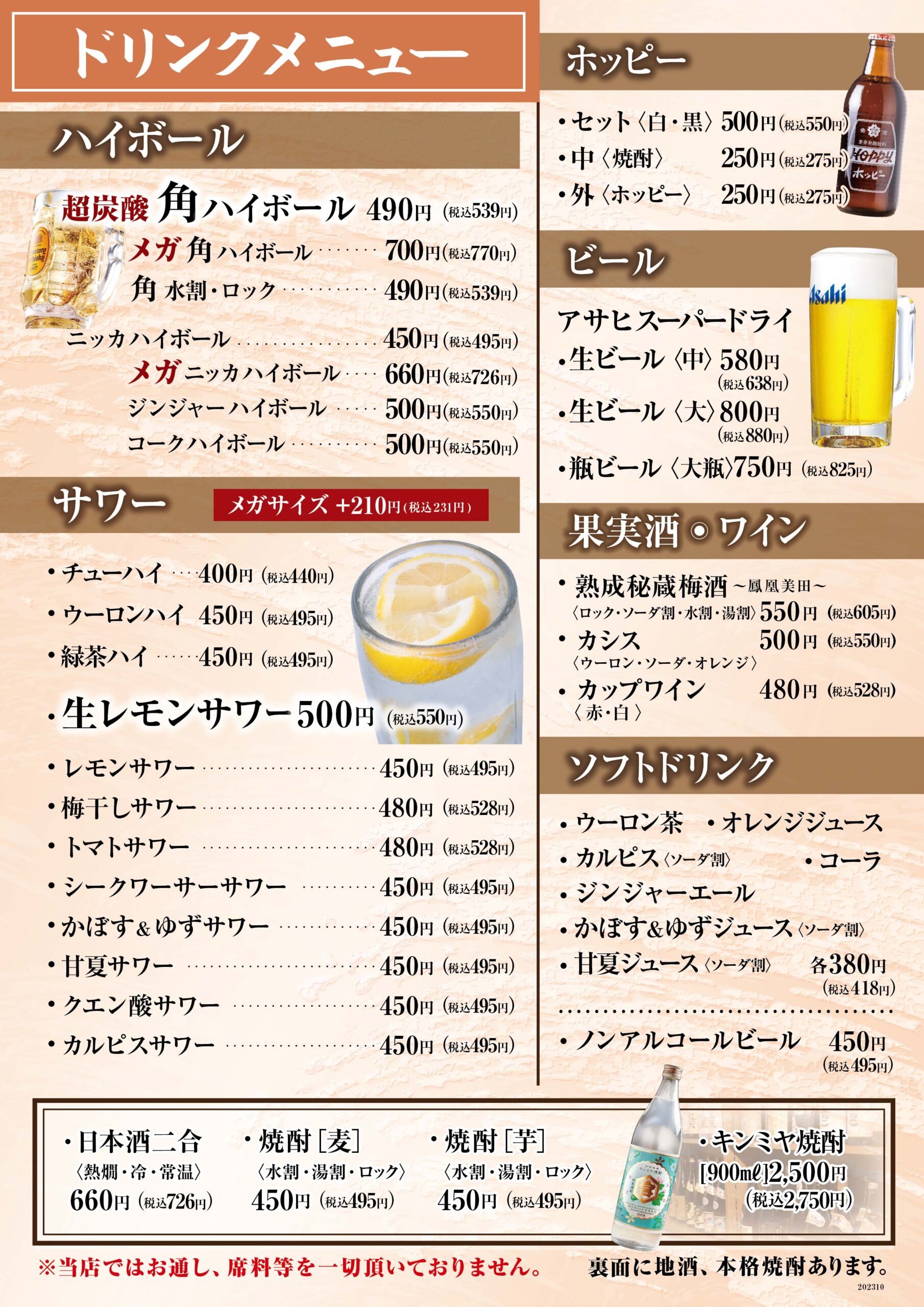 - 生ビール/瓶ビール(アサヒスーパードライ)、ノンアルコールビール、ホッピー(白・黒)、日本酒(燗・常温・冷)、ウイスキー角(ハイボール・水割・ロック)、ジンビーム(ハイボール・水割・ロック・ジュース割)