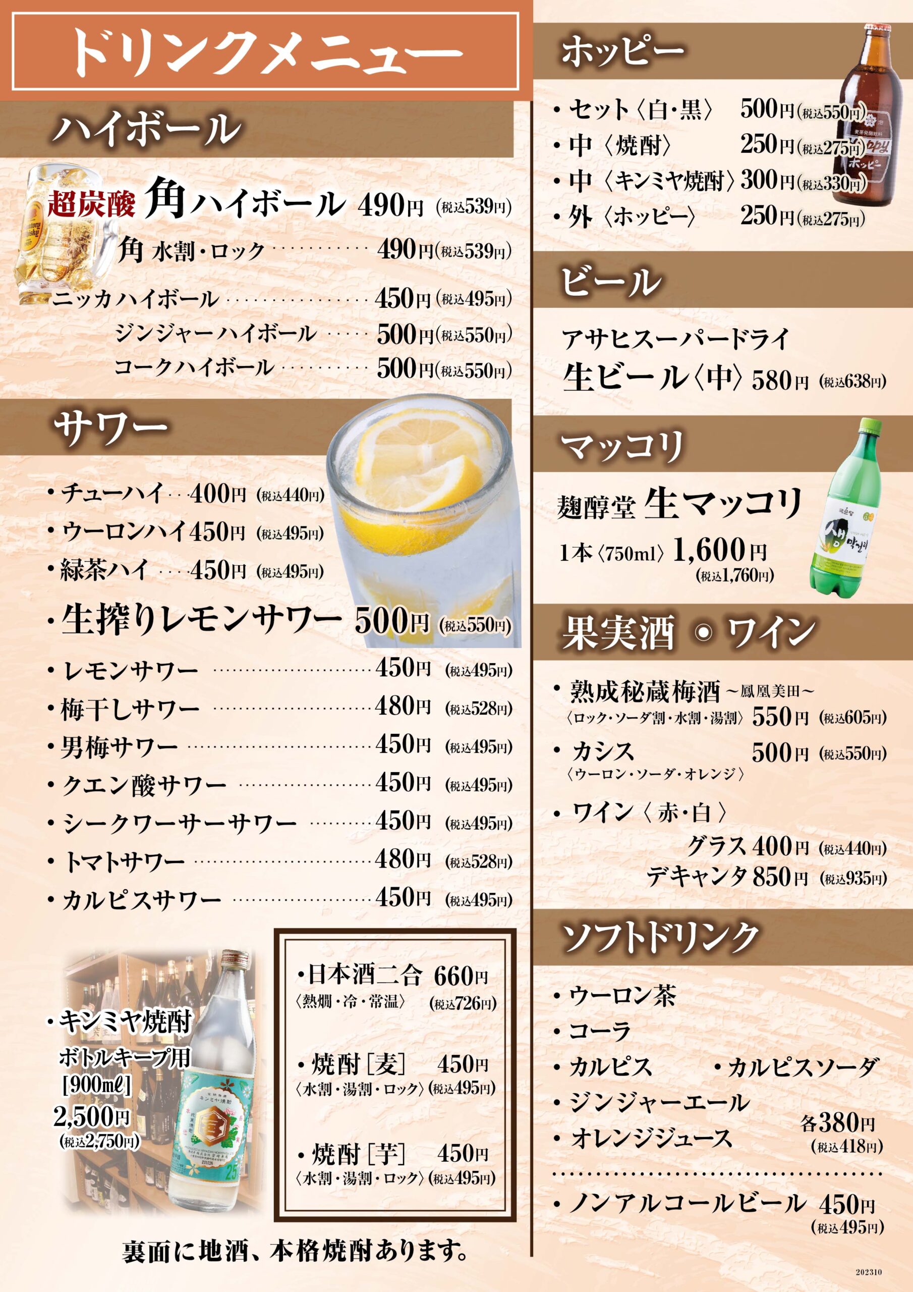 - チューハイ、レモンサワー、ウーロンハイ、緑茶ハイ、カルピスサワー、リンゴ酢サワー他、サワー各種