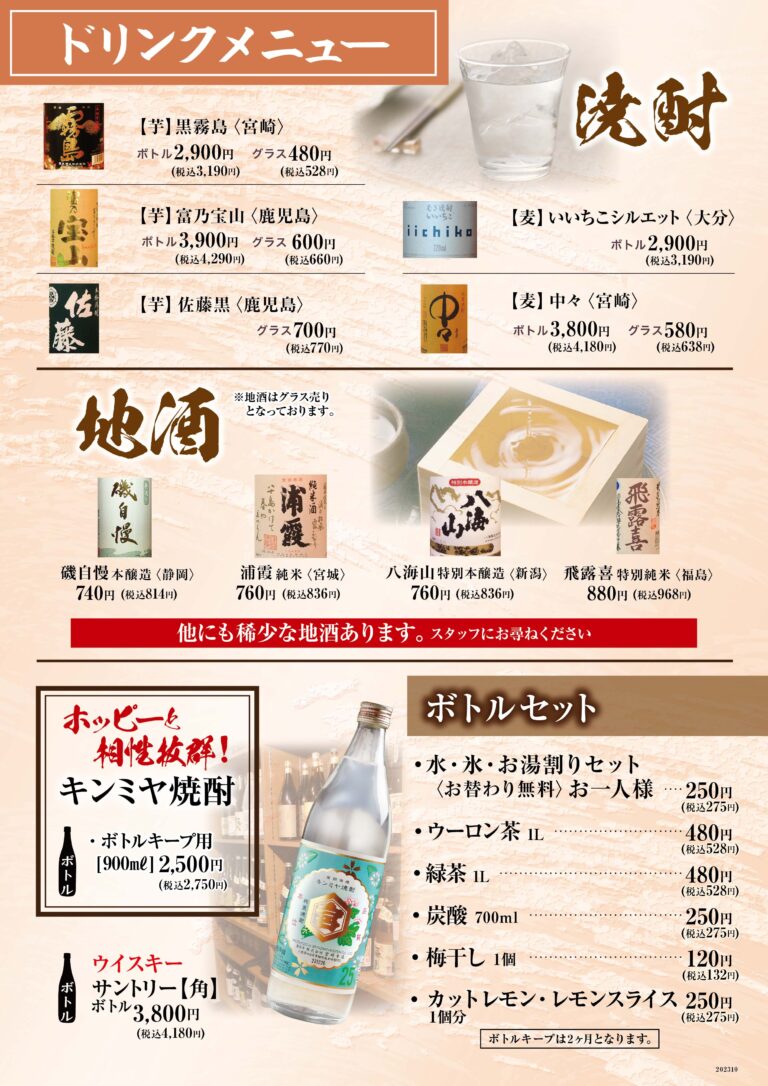 - 生ビール(アサヒスーパードライ)、ノンアルコールビール、ホッピー(白・黒)、日本酒 富久娘(常温・燗)、ウイスキー角(ハイボール・水割・ロック)